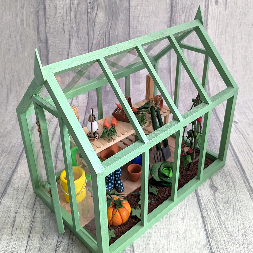 This project was a multiple part commission for a dolls house and miniature scene publication. I was tasked to create a model replica of a greenhouse, including all of its contents.